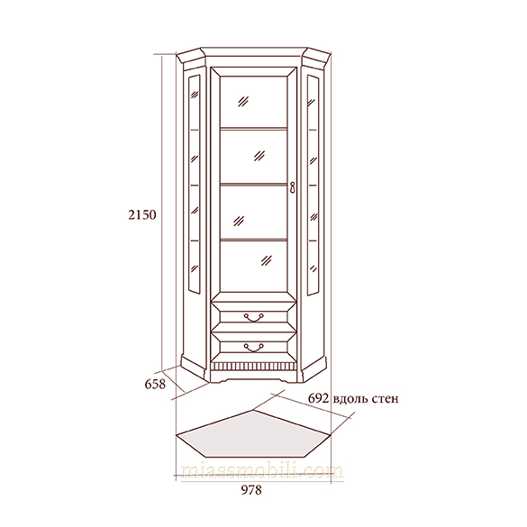 Фасад витрины декорирован накладными элементами. В нижней части шкафа за дверкой расположены полки.