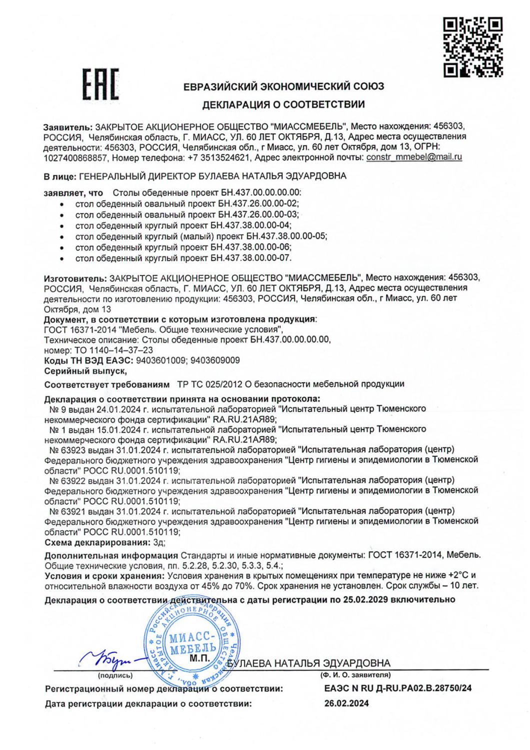 Декларация столы обеденные